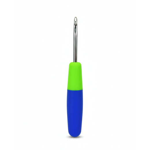 An ergonomic latch hook tool featuring a dual-color comfort grip handle. Each box contains 12 needles.