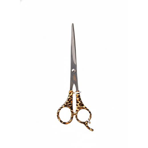 The vibrant leopard print handle combines style with comfort for a professional hair-cutting experience.